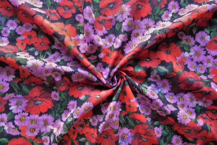 A Beautiful Linen Chambray Floral Print in Poppy Red and Magenta.