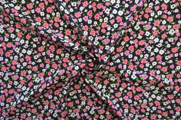 A Lovely Woven Soft Crepe Morracain Style Floral Digital Print In Tones Of Coral Pink, Hot Pink, Baby Pink, White And Bright Green On A Black Background