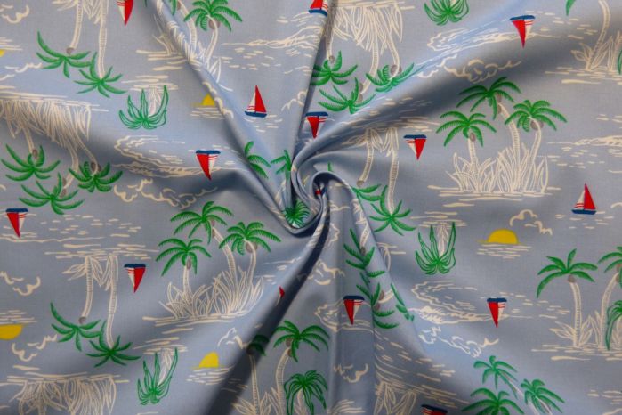 A Beautiful Digital Printed Cotton Drill Holiday Sailing Scene in Sky Blue with Bright Accents of Emerald, Scarlet & Lemon
