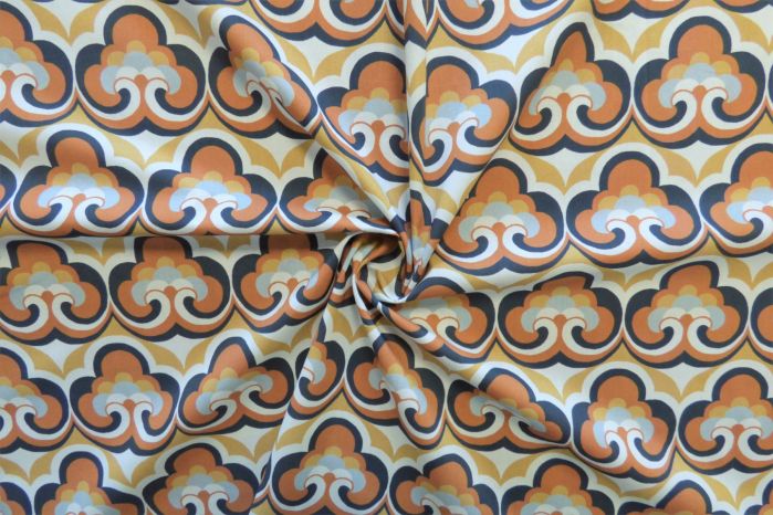 A Typical 1970's Retro Vintage Style Bold Lady McElroy Designer Print in Mustard, Midnight, Ice Blue, Ivory And Maple Orange
