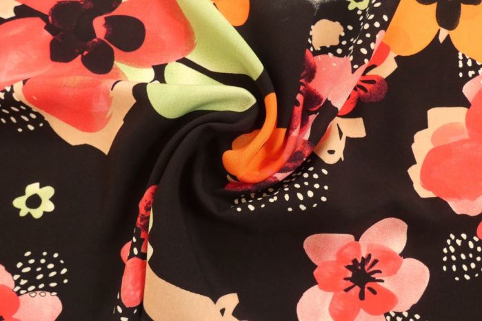 A Lovely Viscose Challis Lawn Digital Floral Print in Tones of Crimson Red, Coral Pink, Orange, Peach, Lime, White and Black.