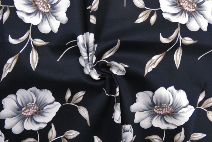 A Stunning Soft Stretch Sateen Drill Digital Floral Print In Tones Of Oxford Navy, Mink, White And Steel Grey