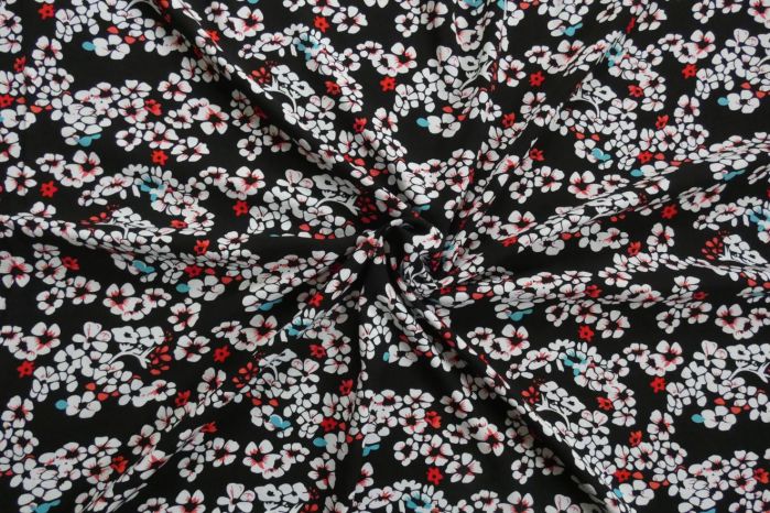 A Lovely Viscose Challis Lawn Digital Floral Print Featuring White and Red Flowers on a Black Background.