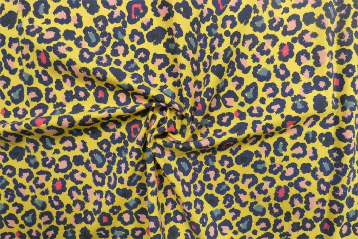 A Lovely Luxury Stretch Organic Jersey Animal Print In Tones Of Canary, Royal Blue, Pink And Teal