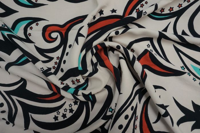 A Lovely Soft Morracain Crepe Digital Retro-Style Design in Tones of Rust, Aqua, Black & Cream