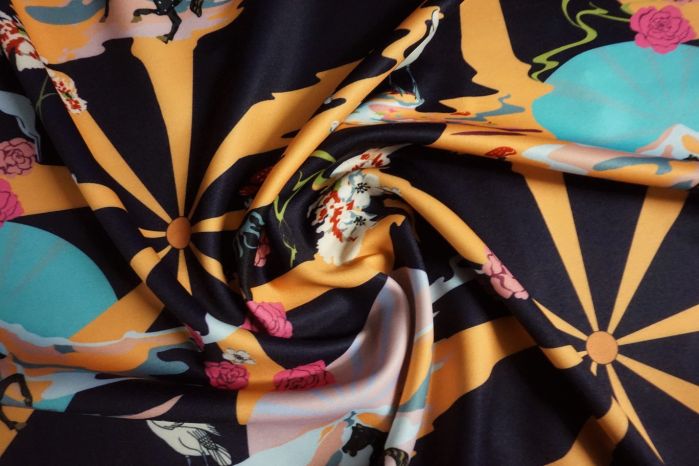 A Lovely Digital Print on Scuba Jersey in Peach Orange and Turquoise Tones.