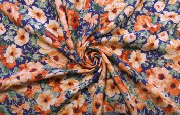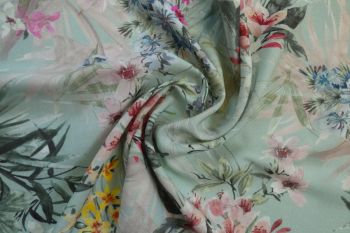 A Lovely Viscose Challis Lawn Digital Floral Print in Tones of Green, White, Fuchsia, Indigo, Mauve and Dark Purple.
