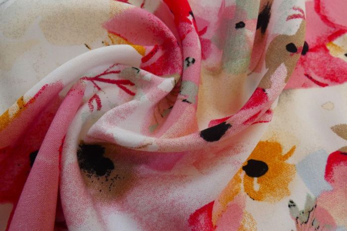 A Lovely Viscose Challis Lawn Digital Floral Print in Tones of Crimson Red, Rose Pink, Ochre, Mint, Pale Blue, Tan, Black and White