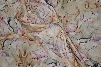A Lovely Soft Touch Organic Rayon Gemma Sateen Digital Stripe Print In Tones of Brick Red, Golden Yellow, Tan, Natural and Cadet Blue.