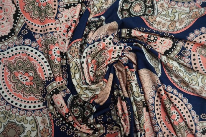 A Retro Circles Digital Printed Slinky Jersey Design in Peach and Navy.