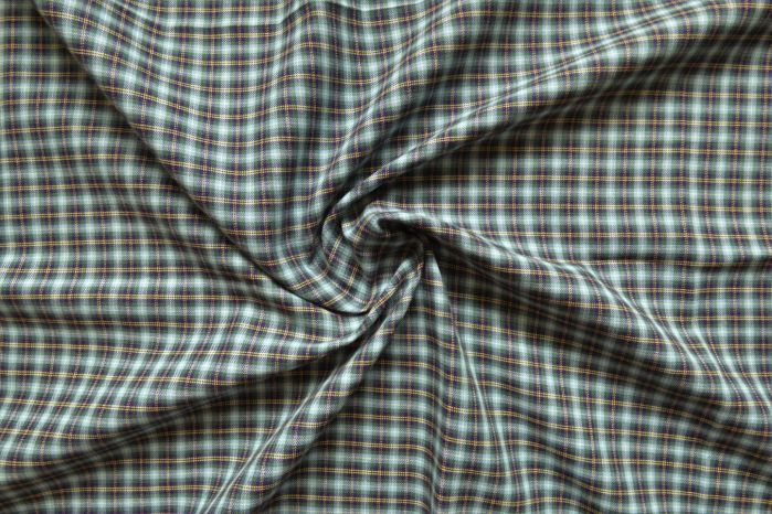 Exclusive Cotton Italian Small Tartan Style Check Shirting In Tones Of Forest Green, Light Navy, Lemon And Pale Sky Blue