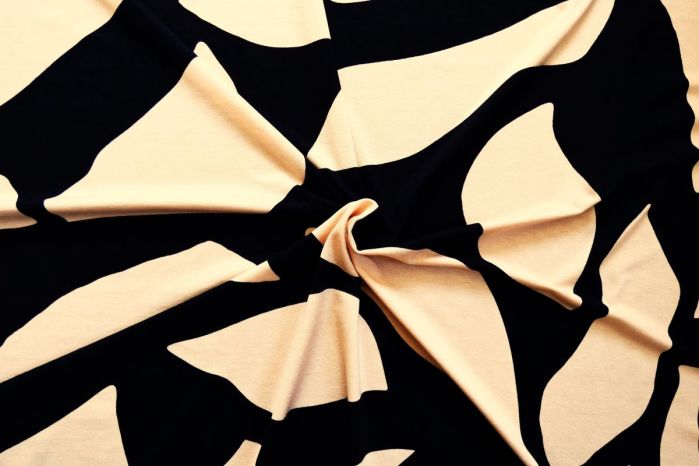 A Lovely Soft Stretch Juliet Jersey Digital Abstract Shape Print In Navy and Peach.