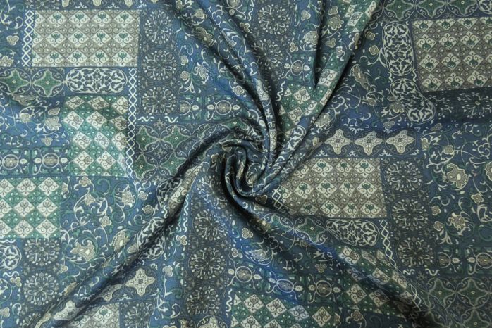A Lovely Vintage Inspired Viscose Warm-Handle Challis Moroccan Style Print in Tones Of Teal, Marine Blue And Dove Grey