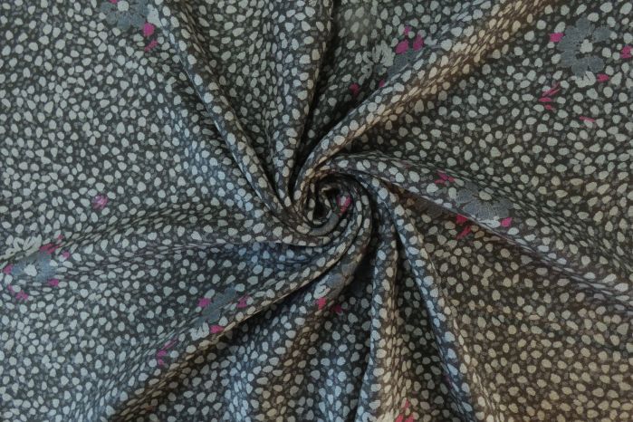 A Beautiful Soft Crepe Digital Abstract Floral Print In Tones Of Forest Green, Magenta & Grey