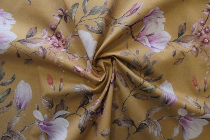 A Lovely Pure Cotton Soft Handle Lawn Digital Delicate Floral Print On An Ochre Background