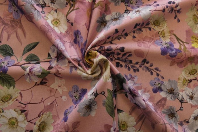A Lovely Pure Cotton Soft Handle Lawn Digital Floral Print In Delicate Tones On A Baby Pink Background