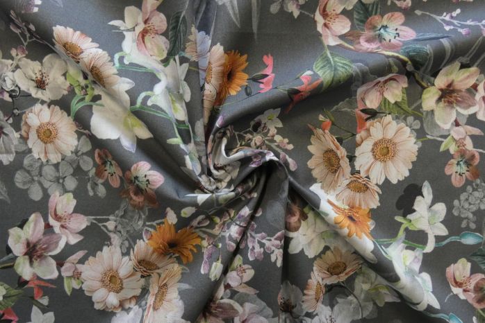 A Lovely Pure Cotton Soft Handle Lawn Digital Floral Print in Tones of Charcoal Grey, Ivory, Old Gold, and Blush