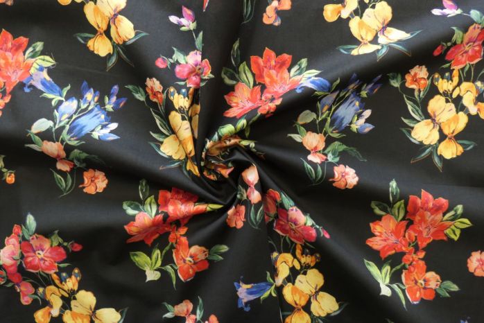A Lovely Pure Cotton Soft Handle Lawn Digital Floral Print in Colourful Tones On A Jet Black Background