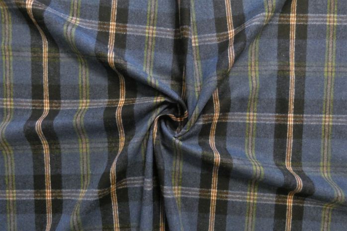 A Lovely Cosy Wool Mix Flannel Tartan Style Check In Tones Of Denim Blue, Chocolate Brown, Lime Green, Black And Ivory