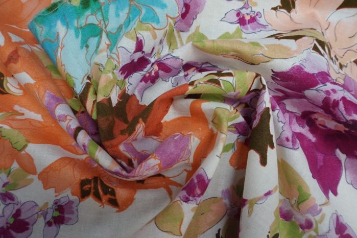 A Digitally Printed French Cotton Floral in Pink, Green, Orange Tones
