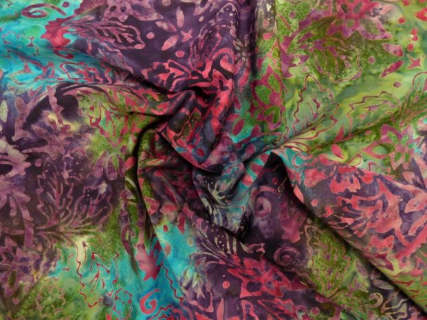 A Cotton Printed BatikPoplin Weight Tyedye In Deep Purple, Green And Blue Tones