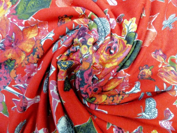 An Ex London Designer Stretch Jersey Digital Printed Floral In Tones of Soft Red, Orange, Pink And Green