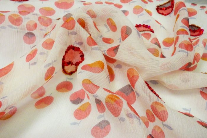 A Digital Red, Nectarine Orange And Brown Print with Stitched on Red And Nectarine Sequins On An Off White Background
