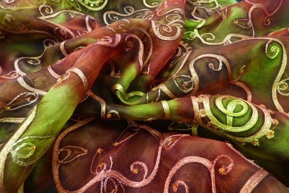 An Indian Silk Embroidered Oriental Style Voile in Deep Red, Soft Green And Gold Tones.