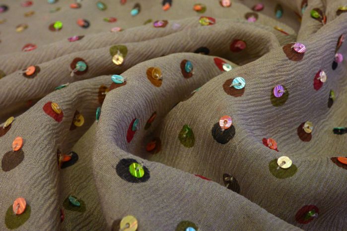 A Beautiful Array of colour Sequins embroidered onto a Digital Multi-coloured Spot Print & Pale Brown Background