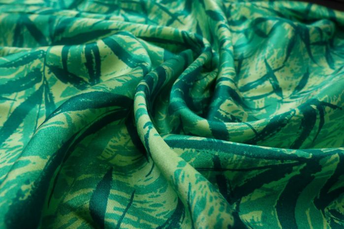 A Silk Satin Digital Tropical Leaf Print In Tones of Emerald to Soft Green