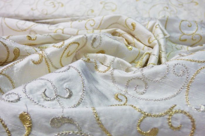 A 100% Silk Embroidered Dupion in Gold And Silver Swirl on an Ivory Background