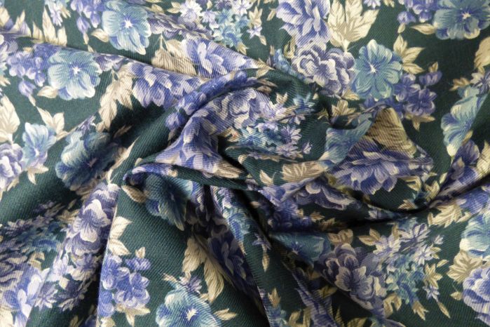 A Vintage Floral Brushed Twill in Tones of Blue, Teal & Grey on a Green Background