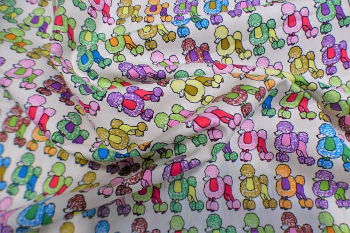 A Colourful 100% Cotton Poplin Digital Poodle Print in White with Turquoise, Pink, Orange, Green, Yellow & Purple Tones