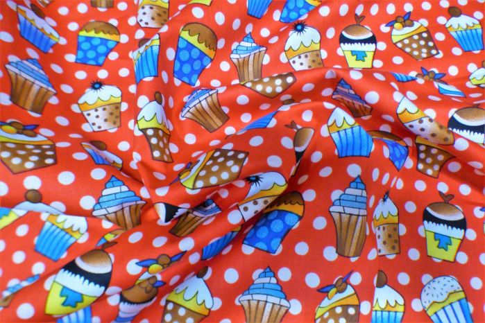 A Colourful 100% Cotton Poplin Digital Cupcake Print in Red, Ivory, Brown, Yellow and Blue Tones