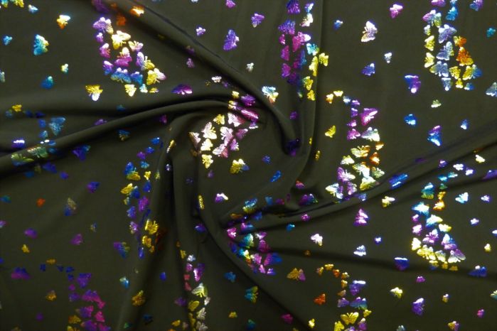 High-Stretch Holographic Lurex-Style Butterflies Dancewear Lycra Fabric In Rainbow Tones On Black