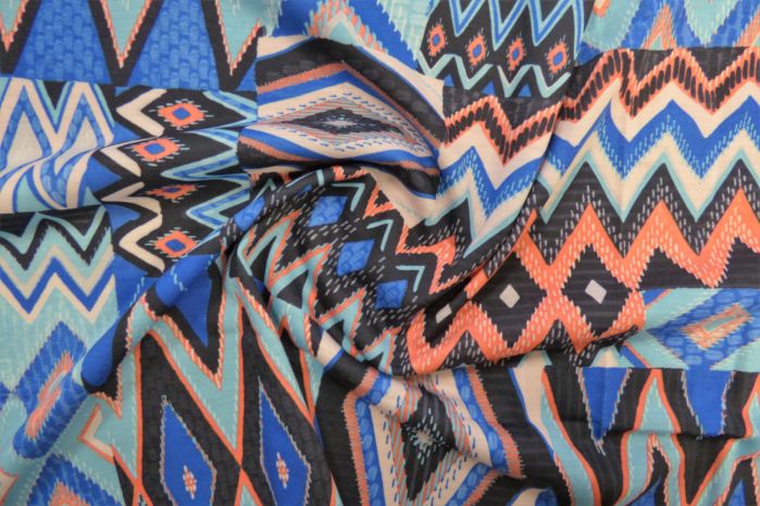 A Stunning Vibrant Aztec Pattern On A Knitted Jersey In Tones Of Peach, Aqua, Black, White And Cobalt
