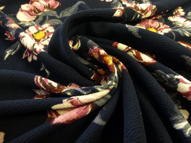A Lovely Textured Ponte Roma Floral Jersey in Raspberry, Ivory, Dark Grey on Navy