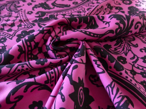 A Fancy Pink & Black Floral Damask Print Ponte Roma Jersey