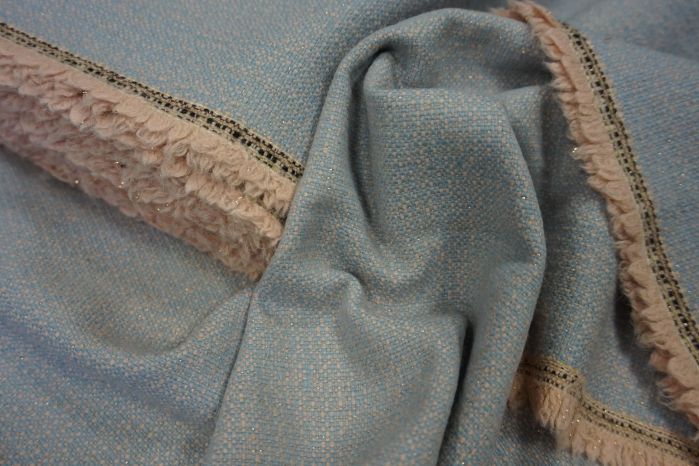 A Lightweight Tweed in Sky Blue & Baby Pink with a Touch of Glamour - This is Interwoven with Metallic Rose Pink Thread!