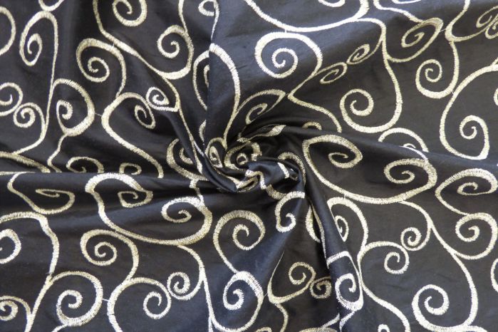 A Beautiful 100% Silk Embroidered Dupion With Curlicue Designs In Tones Of Black and Gold.