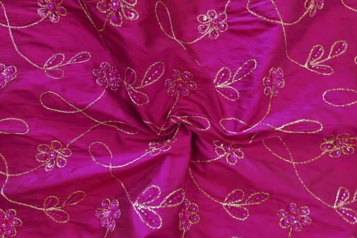 A Beautiful 100% Silk Embroidered Dupion with Floral Designs in Deep Magenta Featuring Delicate Beads