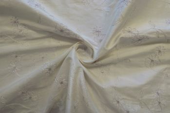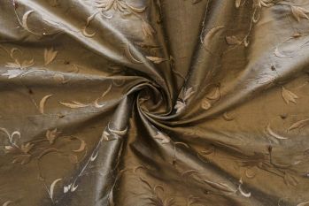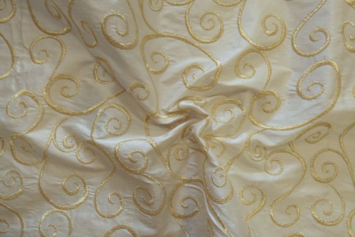 A Beautiful 100% Silk Embroidered Dupion With Curlicue Designs In Tones Of Ivory & Gold