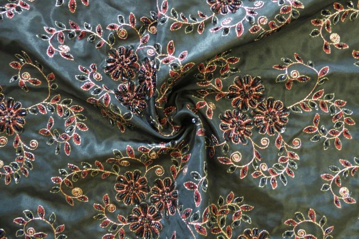 A Beautiful 100% Silk Embroidered Dupion with Floral Designs in Black & Ruby With Gold Accents