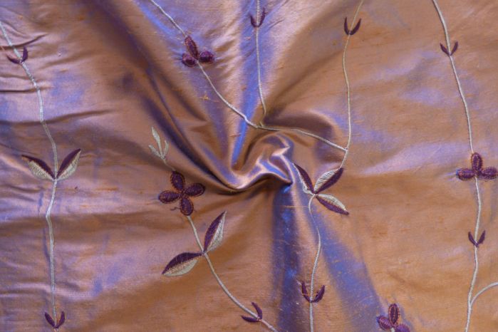 A Beautiful 100% Silk Embroidered Dupion with Floral Designs in Burnt Orange, With Blue Tones and Beige & Burgundy Embriodery