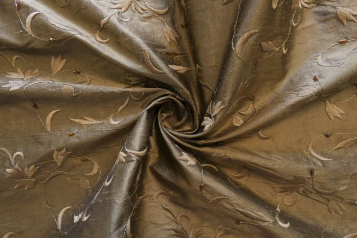 A Beautiful 100% Silk Slubbed Embroidered Dupion In Olive Gold Featuring Delicate Beads.