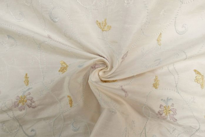 A 100% Silk Embroidered Dupion in Ivory Featuring Floral Embroidery in A Subtle Mauve and Pale Gold.