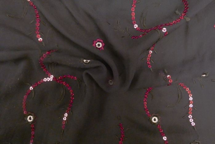 A Beautiful 100% Silk Chiffon in Black Featuring Sequins and Embroidered Flowers in Cherry Red.