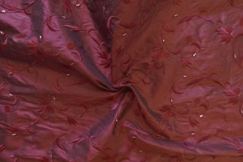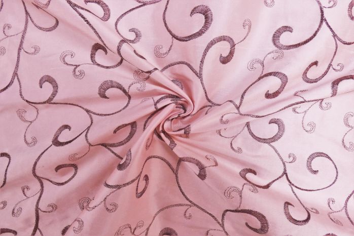 A 100% Silk Embroidered Dupion in Baby Pink With Deep Rose Gold Curlicue Designs.
