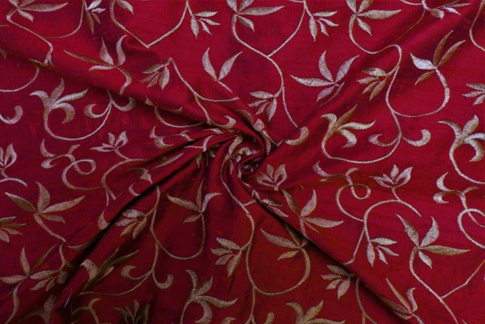 A 100% Silk Embroidered Dupion in Deep Wine With Antique Gold Floral Designs.