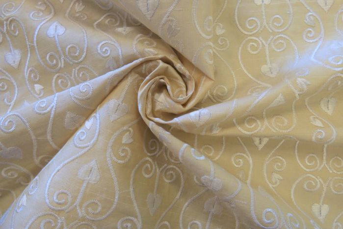 A Beautiful 100% Silk Embroidered Dupion With Curlicue Designs In Tones Of Ivory and Beige.